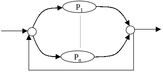 where $P$ represents the scored phonetic graph, $L$ is the lexicon mapping pronunciations to lexical units, and $G$ is the language model. The basic topology of the recognizer, illustrated in Figure 1, implies that traversing the network requires going through one or more words in the vocabulary. This is represented with words $w_1 \ldots w_n$ for the vocabulary and the loop back transition allowing for an arbitrary number of words.