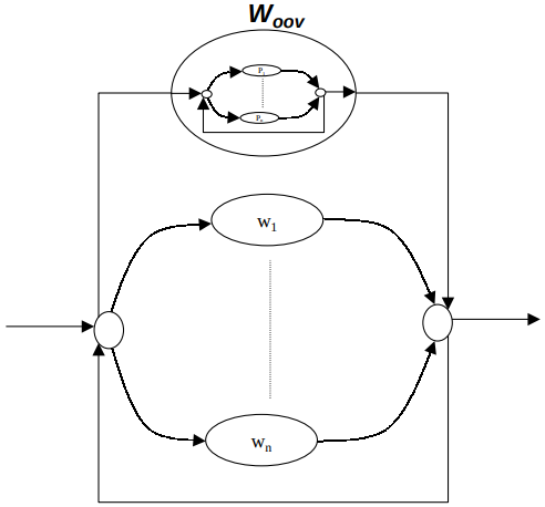 The search space $S_H$ relies mainly on the union of the two search spaces. The union operation, $\cup$ , provides the choice of going through either the word network from the vocabulary or through the generic word network. The $\star$ operation is the closure operation on FSTs. This operation allows for switching between the two networks during the same search allowing for the transition into and out of the OOV network as many times as needed.