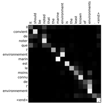 The proposed approach provides an intuitive way to inspect the (soft-)alignment between the words in a generated translation and those in a source sentence. This is done by visualizing the annotation weights 0% from Eq. (6), as in Fig.3. Each row of a matrix in each plot indicates the weights associated with the annotations. From this we see which positions in the source sentence were considered more important when generating the target word.