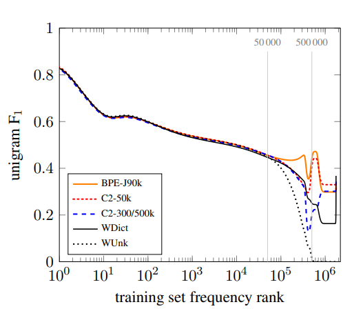 - ↑ Our character n-grams do not cross word boundaries. We mark whether a subword is word-final or not with a special character, which allows us to restore the original tokenization.
