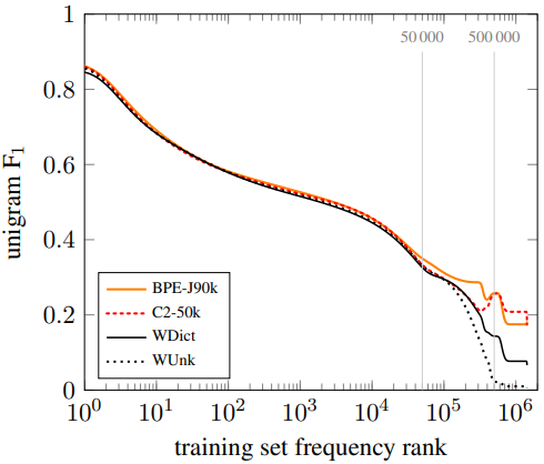 English→German translation results are shown in Table 2; English → Russian results in Table 3. Our baseline WDict is a word-level model with a back-off dictionary. It differs from WUnk in that the latter uses no back-off dictionary, and just represents out-of-vocabulary words as UNK[12]. The back-off dictionary improves unigram F1 for rare and unseen words, although the improvement is smaller for English→Russian, since the back-off dictionary is incapable of transliterating names. All subword systems operate without a back-off dictionary. We first focus on unigram F1, where all systems improve over the baseline, especially for rare words (36.8% → 41.8% for EN → DE; 26.5% → 29.7% for RUEN → RU). For OOVs, the baseline strategy of copying unknown words works well for English → German. However, when alphabets differ, like in English → Russian, the subword models do much better.