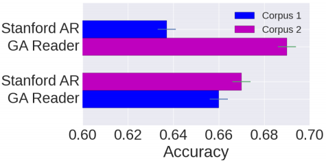 In this work, we show that seemingly minor choices made in step (1), such as the use of pretrained word embeddings and the handling of outof-vocabulary tokens at test time, can lead to substantial differences in the final performance of the reader. These differences are usually much larger than the gains reported due to architectural improvements. As a concrete example, in Figure 1 we compare the performance of two RC models — Stanford Attentive Reader (AR) (Chen et al., 2016) and Gated Attention (GA) Reader (Dhingra et al., 2016) — on the Who-Did-What dataset (Onishi et al., 2016), initialized with word embeddings trained on different corpora. Clearly, comparison between architectures is meaningful only under a controlled initialization method.