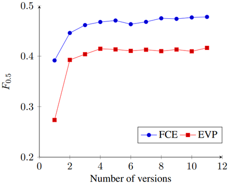 The error generation methods can generate alternative versions of the same input text – the pattern-based method randomly samples the error locations, and the SMT system can provide an n-best list of alternative translations. Therefore, we also investigated the combination of multiple error-generated versions of the input files when training error detection models. Figure 1 shows the F0.5 score on the development set, as the training data is increased by using more translations from the n-best list of the SMT system. These results reveal that allowing the model to see multiple alternative versions of the same file gives a distinct improvement – showing the model both correct and incorrect variations of the same sentences likely assists in learning a discriminative model.