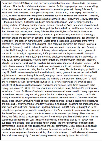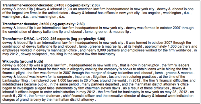 In Figure 4, we show the predictions from three different models (using tf-idf extraction, and the combined corpus) along with the Wikipedia ground truth. As the perplexity decreases we see improvements in the model outputs, in terms of fluency, factual accuracy, and narrative complexity. In particular, the T-DMCA model offers a respectable alternative to the Wikipedia version and is more succinct, while mentioning key facts, such as where the law firm was located, when and how it was formed, and the rise and fall of the firm.
