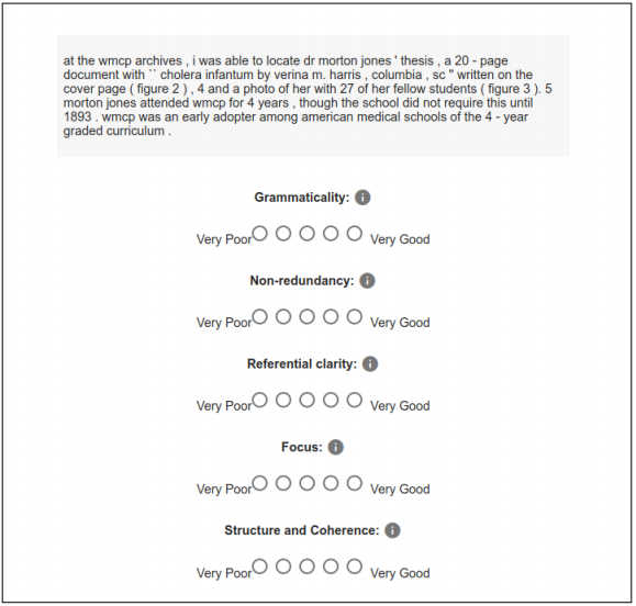 To assess linguistic quality, we randomly selected samples generated by models from the test set and ask raters to choose a score from 1 to 5 (higher is better) for five dimensions: Grammaticality, Non-redundancy, Referential clarity, Focus, and Structure and Coherence. These were used in the past at DUC for evaluating summaries (Dang, 2005). For each model we selected 25 examples and averaged the scores for each question across 3 raters (out of pool of 7).