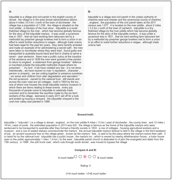 To compare two models by human evaluation, we randomly select examples from the test set and show model outputs side-by-side in the interface shown in Figure 9. Which side a model appears on is randomized per example and rater. For the experiments in Table 6 we had 3 raters score 25 examples each and computed the ratio of ratings preferring one model over the other.