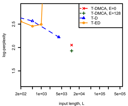 | T-ED, $L = 500$ | T-DMCA-MoE-256, $L = 7500$ | 34.2 | 38.8 | 1.5 |