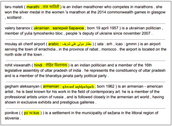 In manual inspection of model outputs, we noticed an unexpected side-effect: models learn to translate names from English into multiple languages, e.g. Rohit Viswanath into Hindi (see Figure 5). Although we did not do a systematic evaluation of the translations, we found they are often correct, and often they are not found in the Wikipedia article itself. We also verified that in general the translation is not merely copied from the source, such as example cases where the target language is the incorrect one (e.g. translation of an English name into Ukrainian).