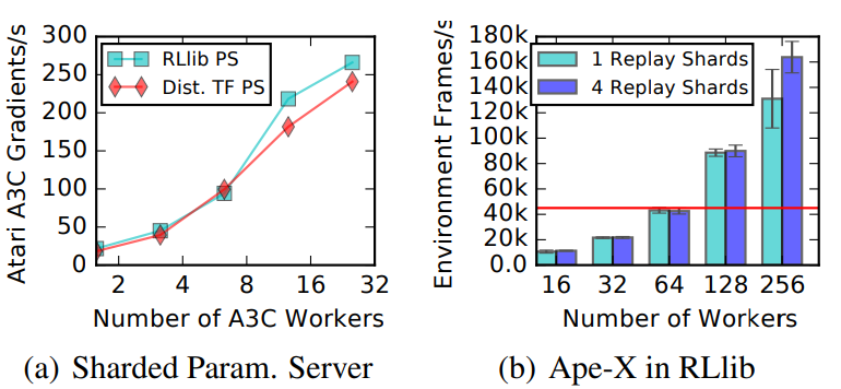 Ape—X implementation: Ape—X (Horgan et al., 2018) is a variation of DQN that leverages distributed experience prioritization to scale to many hundreds of cores. To adapt our DQN implementation, we created policy evaluators with a distribution of e values, and wrote a new high—throughput policy optimizer (N200 lines) that pipelines the sampling and transfer of data between replay buffer actors using Ray primitives. Our implementation scales nearly linearly up to 160k environment frames per second with 256 workers (Figure 5(b)), and the optimizer can compute gradients for ~8.5k 80><80><4 observations/s on a V100 GPU.
