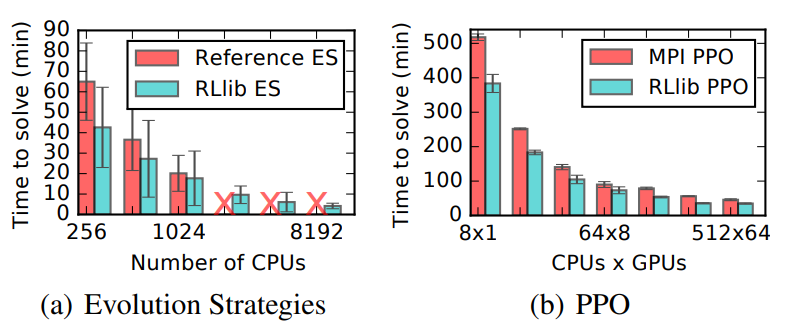 Evolution Strategies (ES) implementation: ES is a derivativefree optimization algorithm that scales well to clusters with thousands of CPUs. We were able to port a single—threaded implementation of ES to RLlib with only a few changes, and further scale it with an aggregation tree of actors (Figure 8(a)), suggesting that the hierarchical control model is both flexible and easy to adapt algorithms for.
