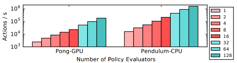 Sampling efficiency: Policy evaluation is an important building block for all RL algorithms. In Figure 7 we benchmark the scalability of gathering samples from policy evaluator actors. To avoid bottlenecks, we use four intermediate actors for aggregation. Pendulum—CPU reaches over 1.5 million actions/s running a small 64><64 fully connected network as the policy. Pong—GPU nears 200k actions/s on the DQN convolutional architecture (Mnih et al., 2015).