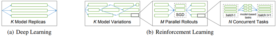 In the absence of a single dominant computational pattern (e.g., tensor algebra) or fundamental rules of composition (e.g., symbolic differentiation), the design and implementation of reinforcement learning algorithms can often be cumbersome, requiring RL researchers to directly reason about complex nested parallelism. Unlike typical operators in deep learning frameworks, individual components may require parallelism across a cluster (e.g., for roll-outs), leverage neural networks implemented by deep learning frameworks, recursively invoke other components (e.g., model-based subtasks), or interface with black—box third-party simulators. In essence, the heterogeneous and distributed nature of many of these components poses a key challenge to reasoning about their parallel composition. Meanwhile, the main algorithms that connect these components are rapidly evolving and expose opportunities for parallelism at varying levels. Finally, RL algorithms manipulate substantial amounts of state (e.g., replay buffers and model parameters) that must be managed across multiple levels of parallelism and physical devices.