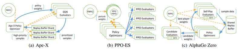- Communication patterns vary, from synchronous to asynchronous gradient—based optimization, to having several types of asynchronous tasks in high—throughput off—policy algorithms such as Ape—X and IMPALA (Horgan et al., 2018; Espeholt et al., 2018).