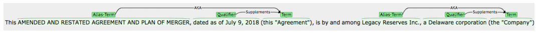 As mentioned above, the SEC data includes the qualifier tag, which is often found qualifying terms or alias terms in contract preambles, as seen in Fig 3. These preambles commonly contain terms with matching alias terms, but no explicit definition. It is also important to note that terms in these preambles are typically not the longer, expanded acronym, or more formal representation (as they may be in the textbook data, by nature of how the textbook's style refers to those terms), but rather the acronym or otherwise shortened form of the term, as this is how they are referred to throughout the rest of the document. Here we see an interesting divergence between the two domains: In textbooks the goal may be to educate the reader of the term, and thus often uses the more formalized representation, but in contracts the goal is usually clarity, brevity, and adherence to legal code.