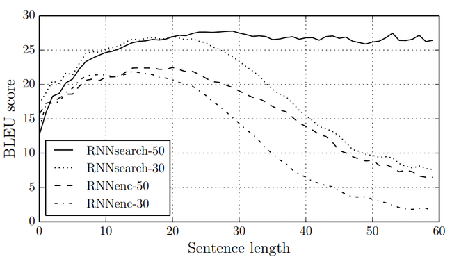 - Bahdanau et al. (2015)'s BLEU Scores of the generated translations on the test set with respect to the lengths of the sentences: