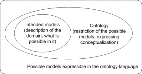 - A conceptualization can be defined as an intensional semantic structure that encodes implicit knowledge constraining the structure of a piece of a domain. Ontology is a (partial) specification of this structure, i.e., it is usually a logical theory that expresses the conceptualization explicitly in some language. Conceptualization is language independent, while ontology is language dependent. The use can be illustrated in the figure below - it shows how an ontology restricts (i.e., defines) possible use of constructs used in the description of the domain. Notice that ontology does not have to express all the possible constraints - the level of details in conceptualization depends on the requirements of the intended application and expressing conceptualization in ontology in addition depends on the used ontology language.