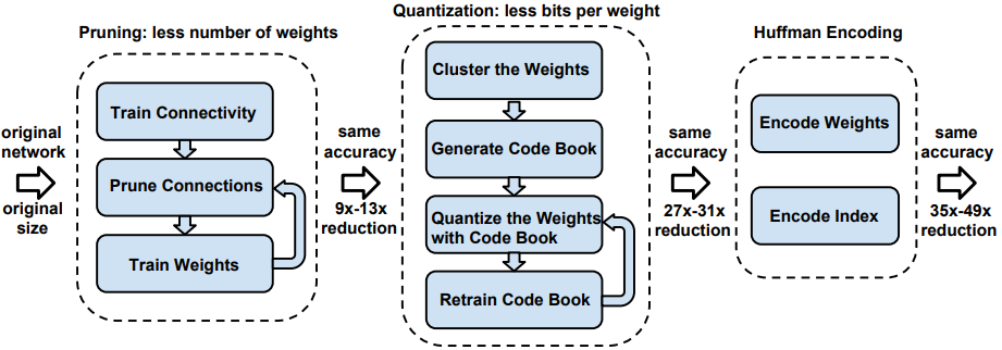 Figure 1: The three stage compression pipeline: pruning, quantization and Huffman coding. Pruning reduces the number of weights by 10×, while quantization further improves the compression rate: between 27× and 31×. Huffman coding gives more compression: between 35× and 49×. The compression rate already included the meta-data for sparse representation. The compression scheme doesn’t incur any accuracy loss. In: Han et al. (2016)