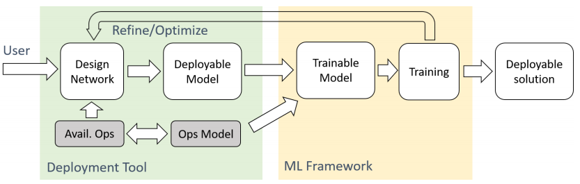 Figure 2: Proposed ML development and deployment approach. The shaded blocks are vendor-specific parts In: Lai & Suda, (2018)