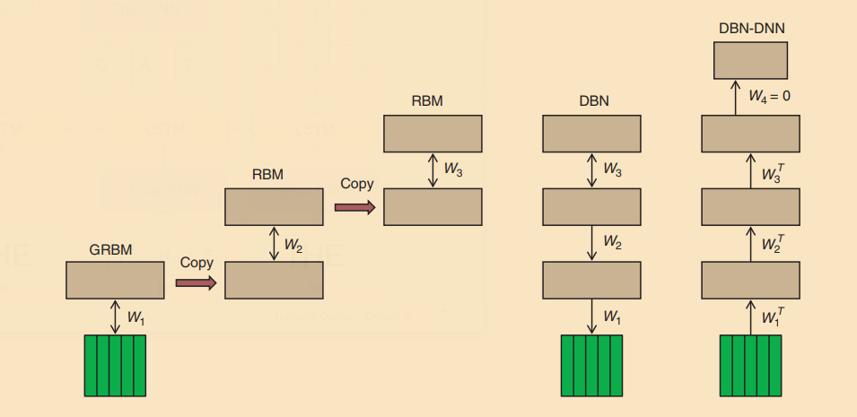 [FIG1] The sequence of operations used to create a DBN with three hidden layers and to convert it to a pretrained DBN-DNN. First, a GRBM is trained to model a window of frames of real-valued acoustic coefficients. Then the states of the binary hidden units of the GRBM are used as data for training an RBM. This is repeated to create as many hidden layers as desired. Then the stack of RBMs is converted to a single generative model, a DBN, by replacing the undirected connections of the lower level RBMs by top-down, directed connections. Finally, a pretrained DBN-DNN is created by adding a “softmax” output layer that contains one unit for each possible state of each HMM. The DBN-DNN is then discriminatively trained to predict the HMM state corresponding to the central frame of the input window in a forced alignment.
