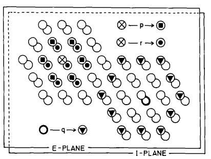 Fig. 4. A small part of the simulated cortex, showing the hexagonal array of the E-cells (upper plane) and the I-cells (lower plane). The different symbols are used to designate those cells which are connected with strengths, p, r and q. Every cell is connected with its neighbors in the same way (except at the borders). In: Chr. Von der Malsburg (1973). "Self-organization of orientation sensitive cells in the striate cortex".(PDF) Kybernetik. 14: 85–100. doi:10.1007/bf00288907.