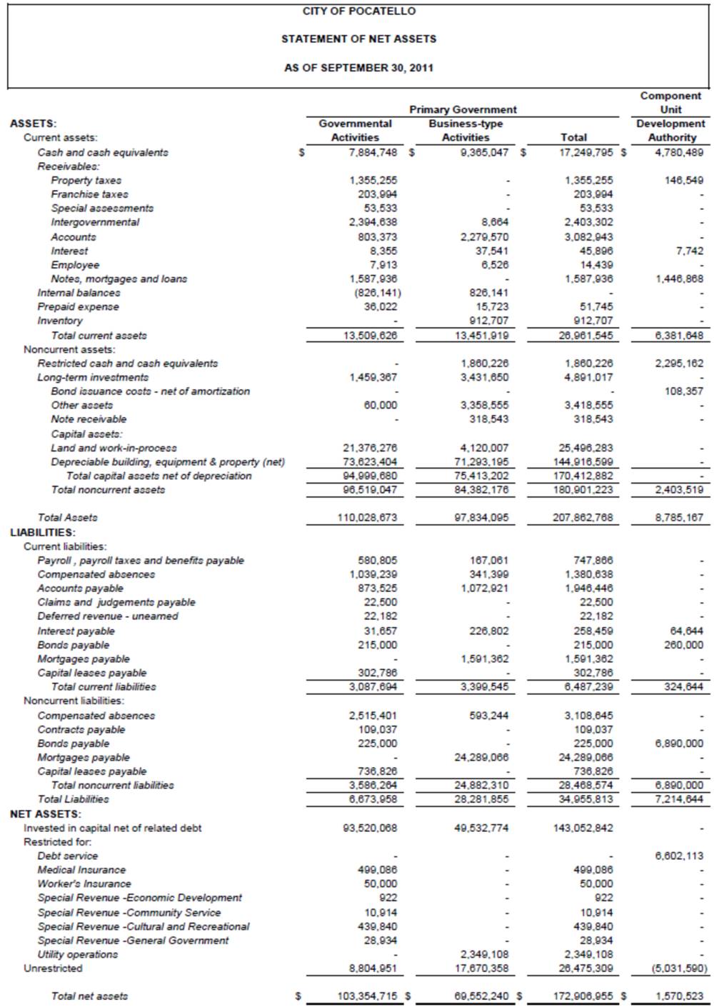 City of Pocatello Statement of Net Assets September 30, 2011