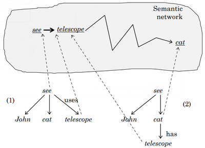 ‘John uses a telescope to see a cat’or‘John sees a cat that has a telescope’,or‘John sees a cat and a telescope’, or maybe‘John that has a telescope sees a cat’, etc.? This ambiguity cannot be resolved using only lexical or syntactical information, since all the interpretations are quite legal syntactically. On Fig. 3, the first two of above variants are represented.