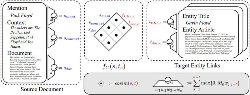 (...) As shown in the middle of Figure 1, each feature in $f_C$ is a cosine similarity between a topic vector associated with the source document and a topic vector associated with the target entity. These vectors are computed by distinct CNNs operating over different subsets of relevant text.
