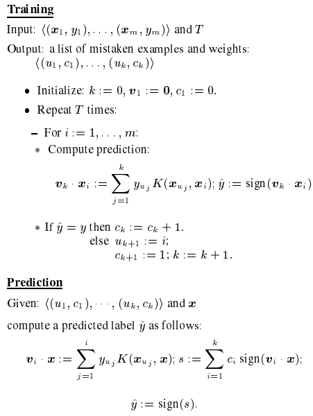 - QUOTE: Following (Freund and Schapire, 1999), we show the training and prediction algorithm of the voted perceptron in Figure 1. The voted perceptron as well as SVM can use a kernel function. We show in Figure 2 the algorithm of the voted perceptron with a kernel function. This algorithm seems to require $O(k^2)$ kernel calculations. However, we can avoid them by taking advantage of the recurrence $\mathbf{v}_{j+1}\cdot \mathbf{x} =\mathbf{v}_j\cdots \mathbf{x}+y_{uj} K\left(\mathbf{x}_{uj},\mathbf{x}\right)$.[1]