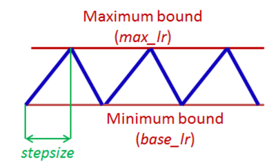Figure 2. Triangular learning rate policy. The blue lines represent learning rate values changing between bounds. The input parameter stepsize is the number of iterations in half a cycle.