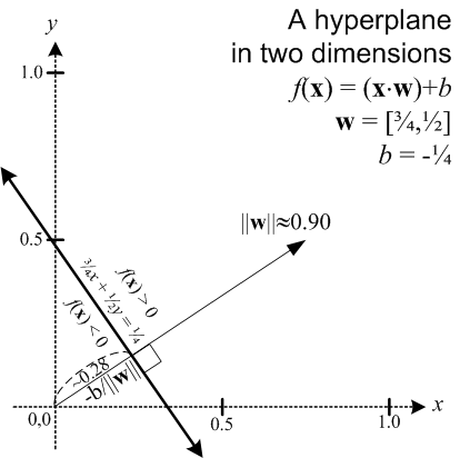 - It can have distance from an arbitrary point x (to the hyperplane) of ((w·x)+b)/ ||w||
