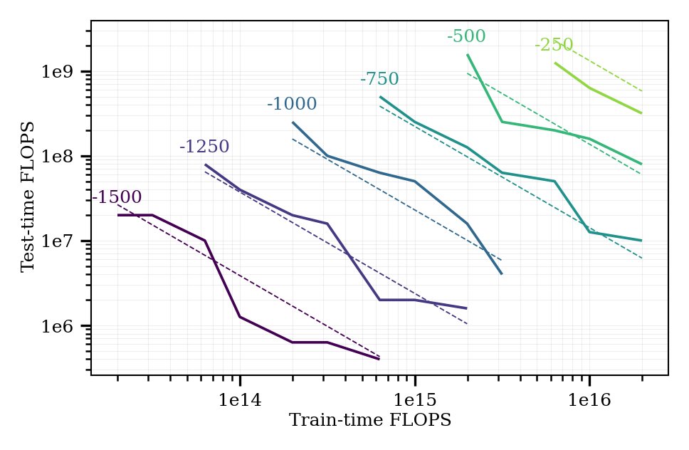 - Train-Time vs. Test-Time Compute Trade-Off: Reveals that investing more compute during the training phase can reduce the inference-phase budget significantly, while maintaining or improving performance. This linear relationship in log-compute offers a novel angle for optimizing the total cost of deployment, whether in industrial or research applications. It underscores how one can strategically decide whether to spend resources “up front” while training or “on the fly” during real-time inference.